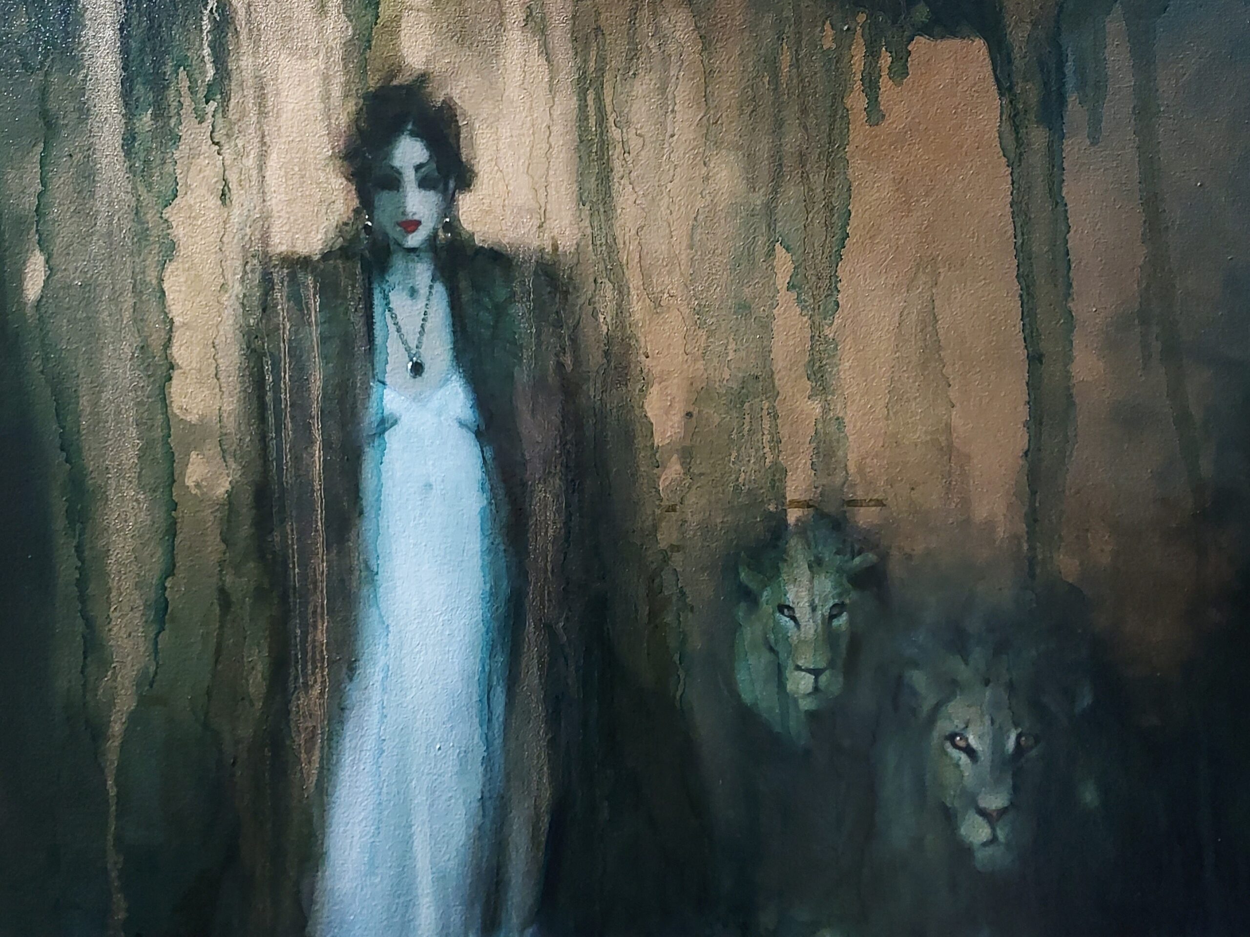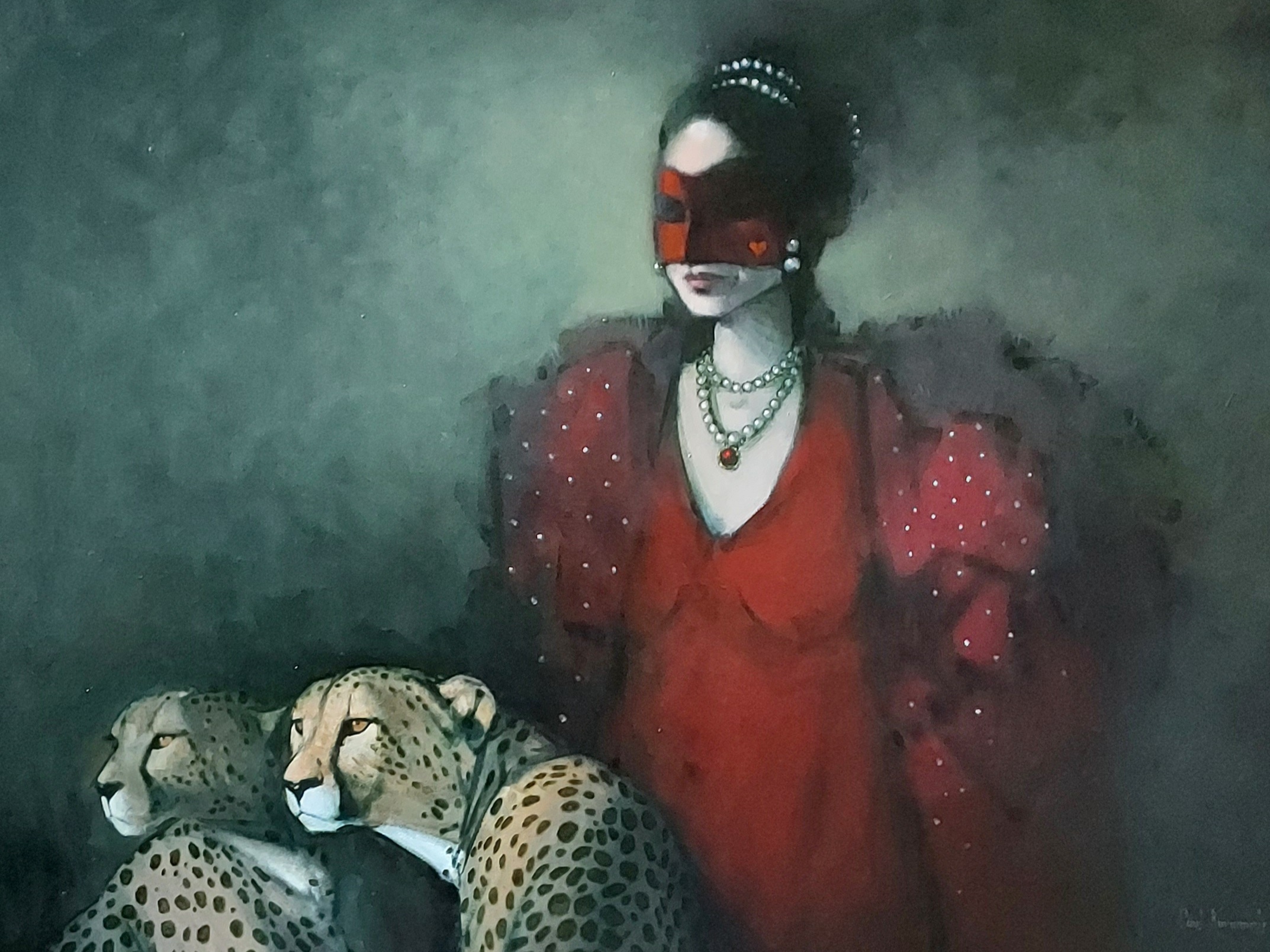 Was the clue to her quest the heart on her mask? By sundown came the Red Queen with her brace of sleek cheetahs searching the night air for her quarry. Robed in red, bedecked in pearls, imperious about her great cats she looks west, and golden eyes glint against the last rays of the day as the cheetahs pause in the hunt of their elusive prey.