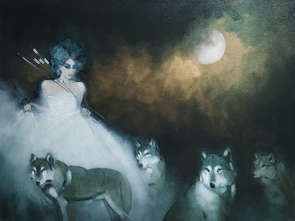 The full moon rises against the darkening grey gold sky. Here's Artemis, between her long, fine arrows and lean quiver, ice - white and cloud - grey wolfhounds join their mistress to step into the hunt.